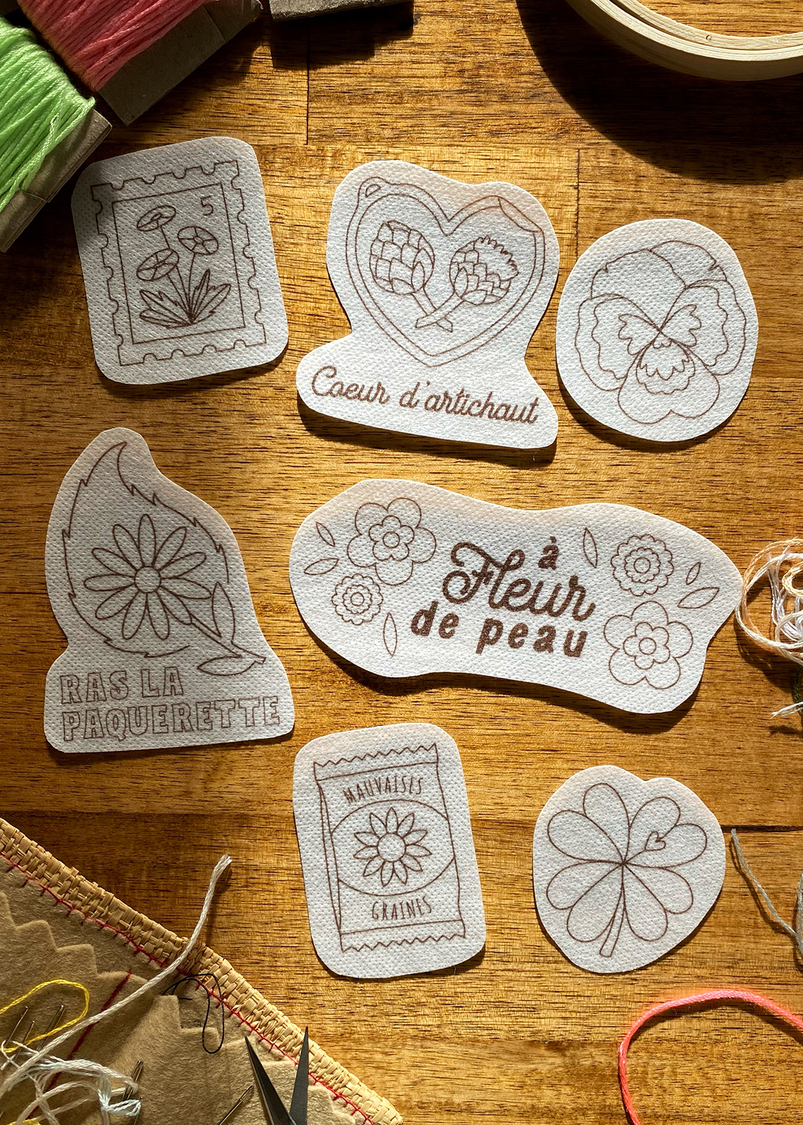 Il suffit simplement de les coller sur ton support et de broder directement par-dessus, en suivant les tracés. Une fois la broderie terminée, passe ton ouvrage sous l’eau tiède pour faire disparaître le tissu hydrosoluble.